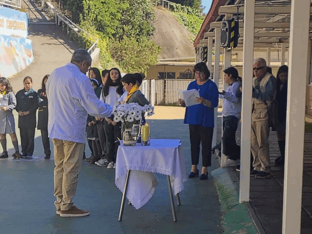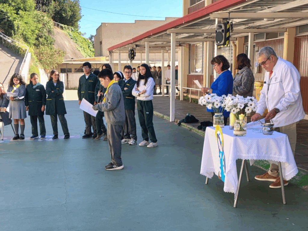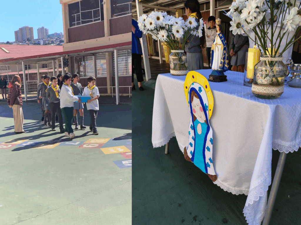 Los grupos pastorales —Infancia Misionera, Scout y Líderes Cristianos— guiaron la celebración. Además, recibimos un regalo muy especial del Colegio Purísima de Lo Vásquez: una imagen de la Virgen de Lo Vásquez que peregrinará por nuestros cursos durante este mes.