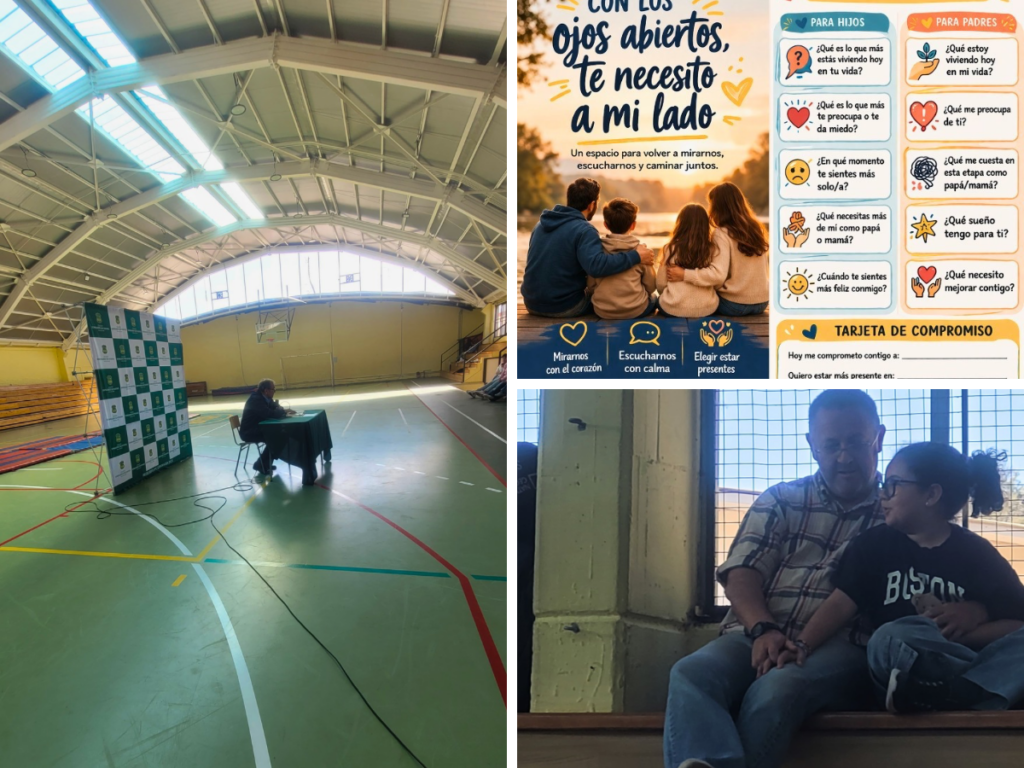 Bajo el lema “Con los ojos abiertos te necesito a mi lado”, la jornada invitó a padres, madres e hijos a detenerse, escucharse y dialogar en torno a los desafíos, inquietudes y necesidades propias de este ciclo vital. A través de un ambiente cercano y reflexivo, se propició un espacio de confianza donde cada participante pudo expresar lo que vive desde su propia experiencia.