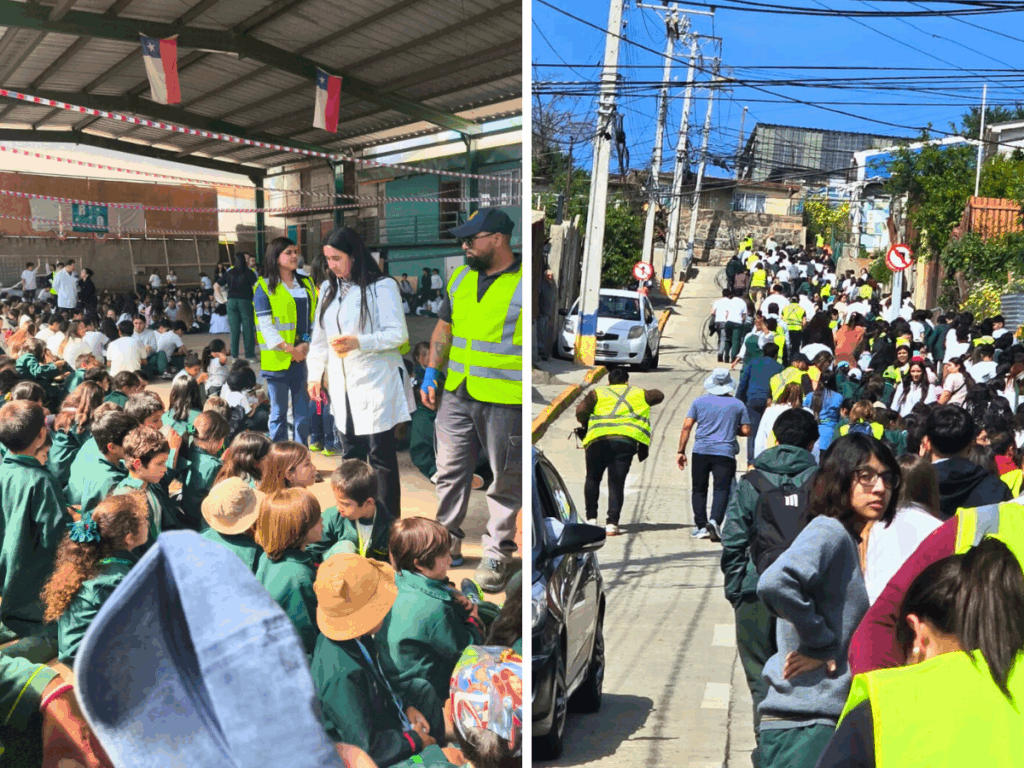 Claudia bruno, rectora del Colegio destacó el orden, compromiso y coordinación de los equipos y cursos, logrando así evacuar a más de mil personas entre estudiantes, docentes y funcionarios, hacia las zonas de seguridad correspondientes.